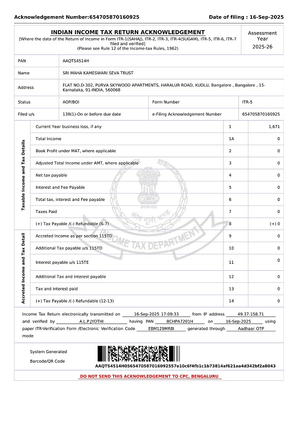 We pray for Ammavaru’s blessings on all our donors and their loved ones. We believe in maintaining transparency of public funds. We thank everyone who have contributed generously for Ammavaru's seva activities, temple development & maintenance.