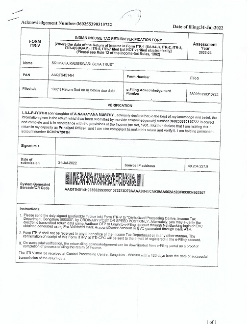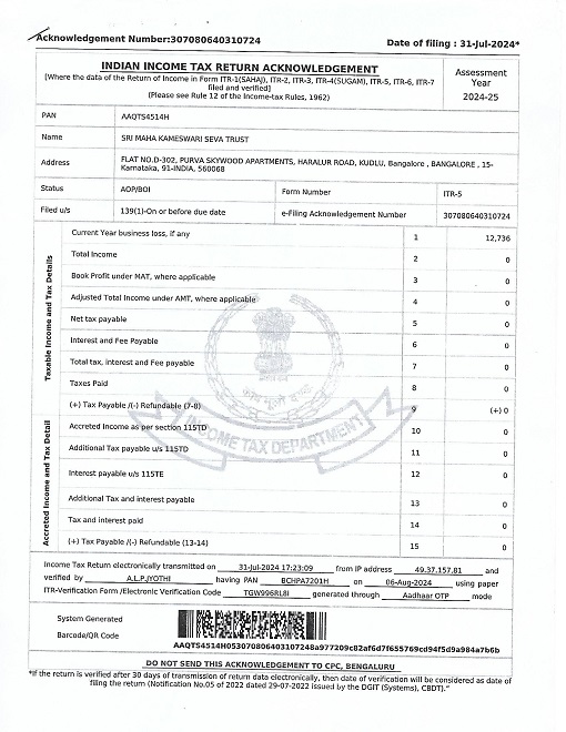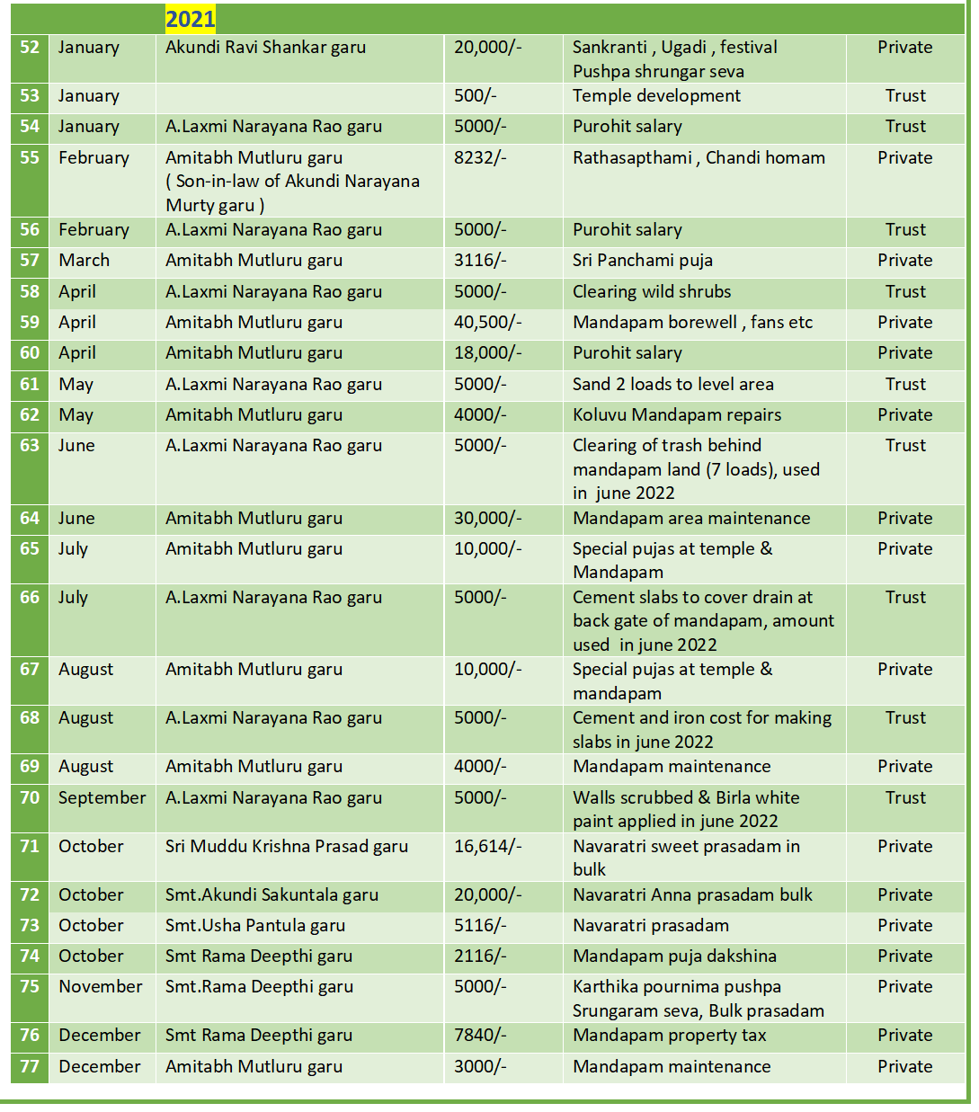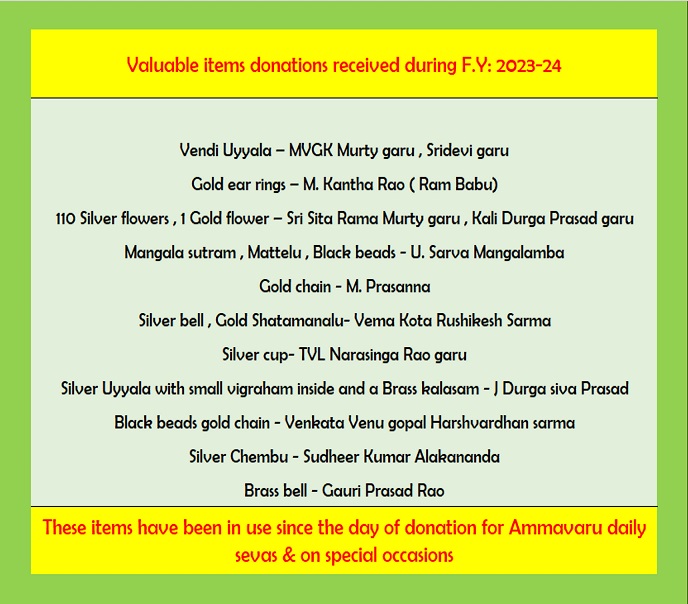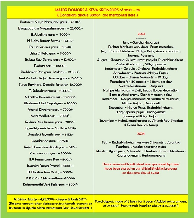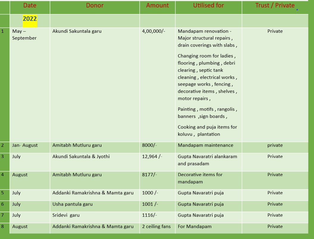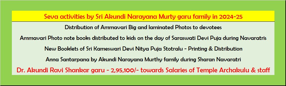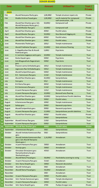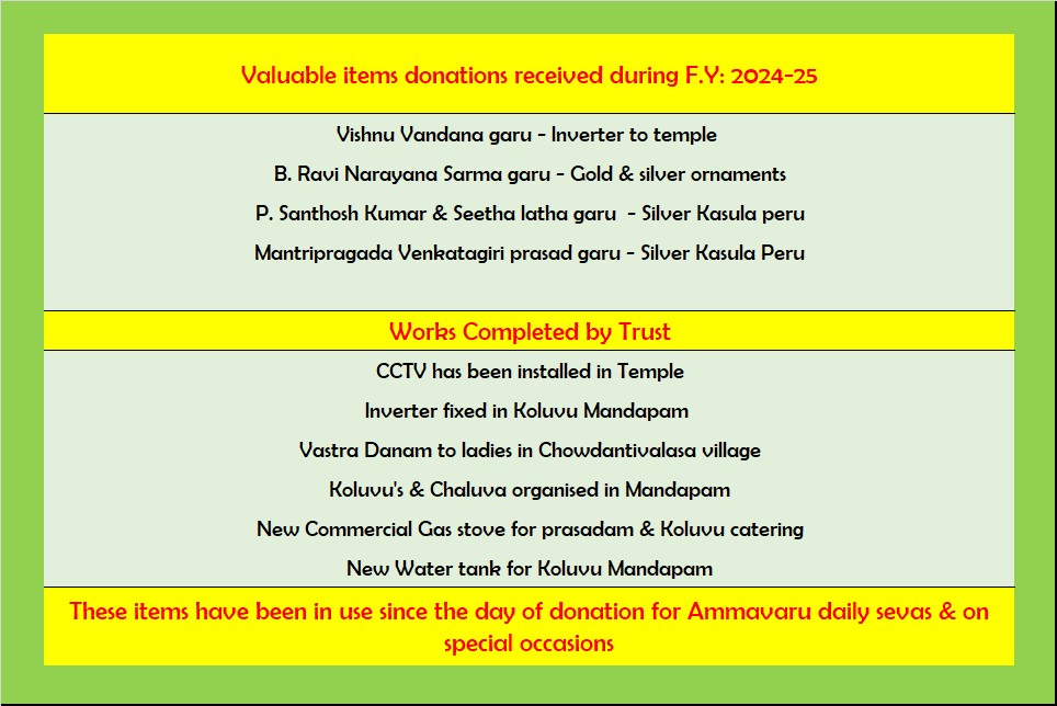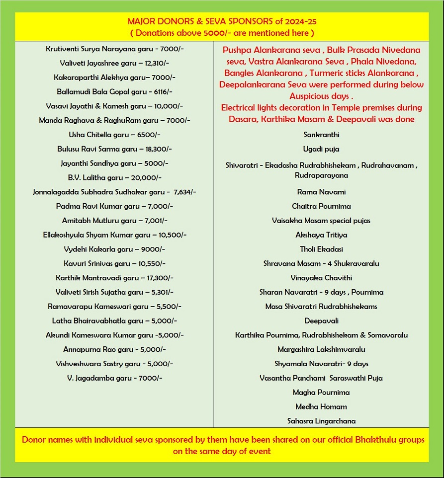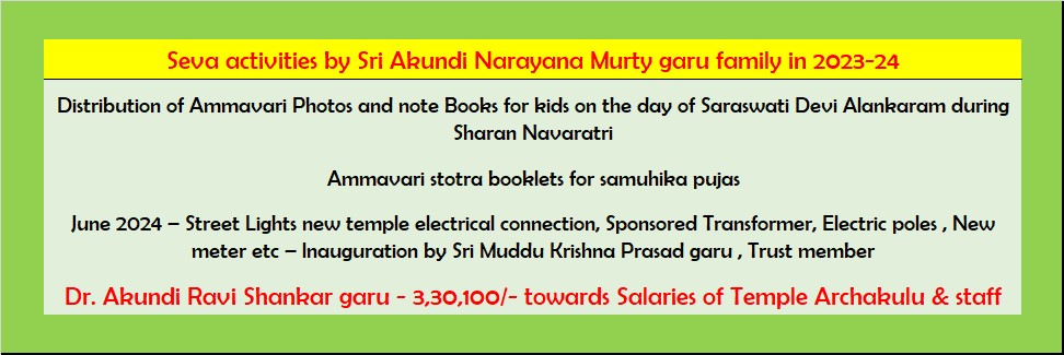 We pray for Ammavaru’s blessings on all our donors and their loved ones. We believe in maintaining transparency of public funds. We thank everyone who have contributed generously for Ammavaru's seva activities, temple development & maintenance.
