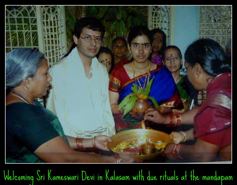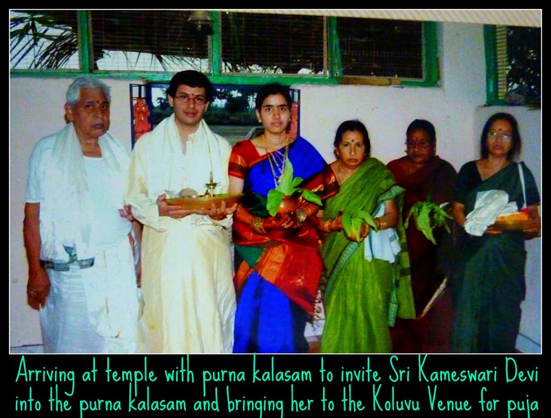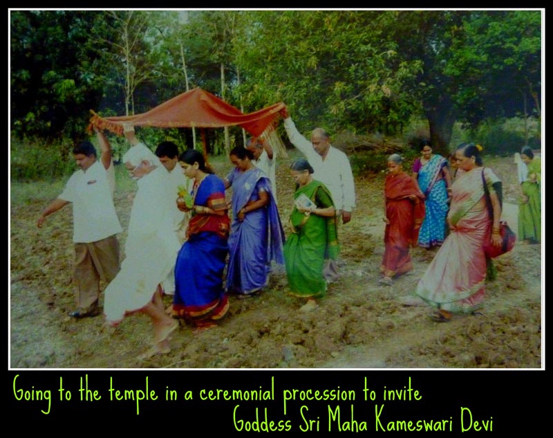 Sri Kameswari Devi Koluvu is like a Yagna. Hundreds of years back, Akundi (Akondi) ancestors of this village who performed Koluvu in their homes would first go to temple to pray to Sri Kameswari Devi and then invite Her to their homes where entire Koluvu was performed ritualistically. Koluvu starts with a ceremonial procession to the temple from Koluvu Mandapam. Walking admist nature with heart full of devotion, before sunrise with sacred Kalasam in hand along with Ullabham/ Chatram echoed by traditional nadaswaram music is a blissful experience in life. After due pooja, the deity / Kuladevatha is invited in a prescribed procedure to come to the Koluvu Mandapam to shower Her blessings. The devotees return in the same ceremonial procession to Mandapam. This ritualistic tradition has been followed by ancestors until today. To preserve this sacred sampradayam and to carry forward this to future generations, Sri Kameswari Devi Koluvu Mandapam was constructed by Sri Akundi Narayana Murty garu in year 2000.